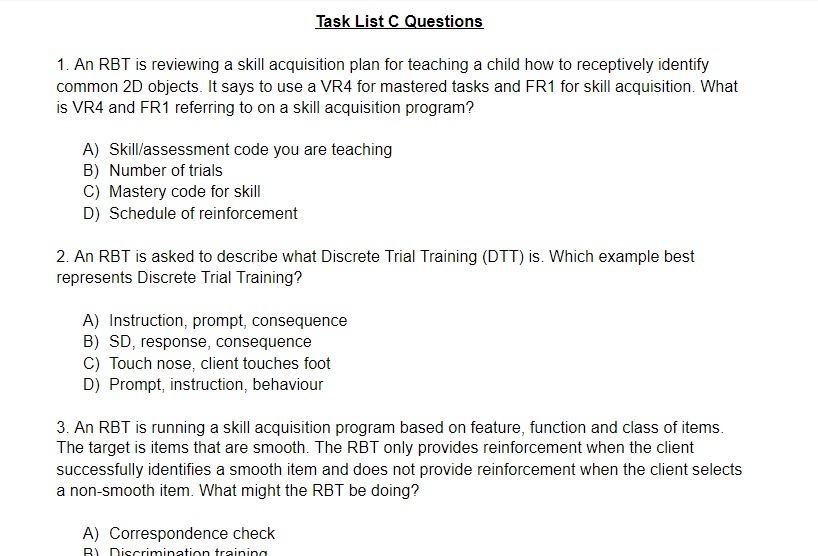 RBT Mock Exam 1: This mock exam is based off of the 2nd edition task list. This mock exam contains 75 questions, broken down by task area. An additional 10 questions have been added to this mock exam for a total of 85 questions. The Answer key is provided at the end of the document.