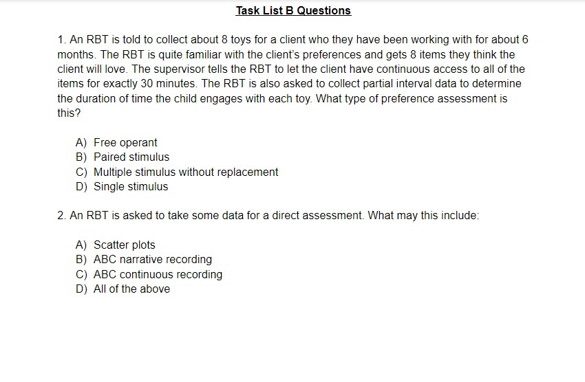 This study guide and mock exam, this file and its content is in no way, shape or form affiliated with, nor endorsed by the Behavior Analyst Certification Board (BACB®) in any way. RBT® BCBA®, BACB® or any other BACB® trademark used is/are registered to the Behavior Analyst Certification Board® (“BACB®”).